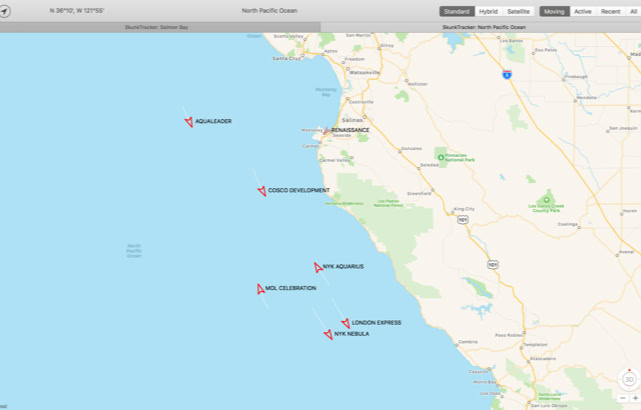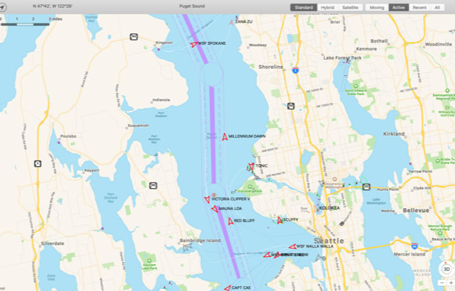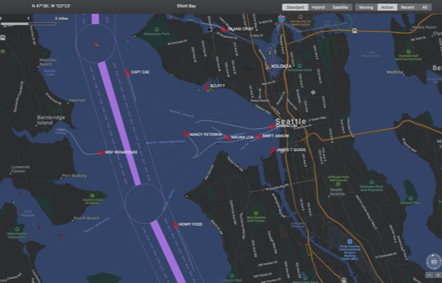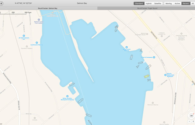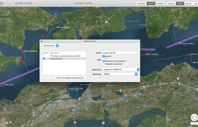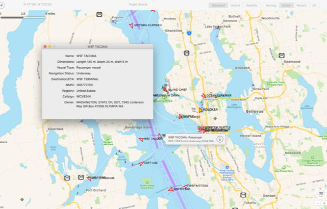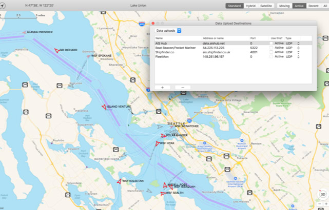 SkunkTracker for macOS displays live, updating maps of ships and boats. It uses AIS data streams from your own dedicated AIS receivers or from network feeds. If you like, you can share your data with services like AIS Hub and Marine Traffic.